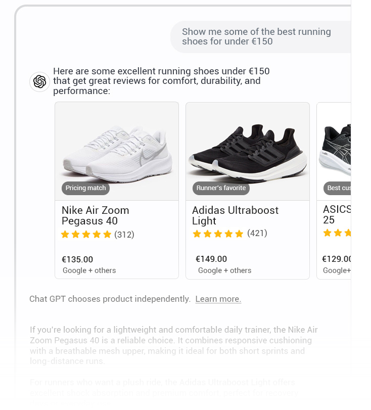Sell directly inside ChatGPT — no redirects, no friction.When a product supports Instant Checkout, customers can complete the purchase directly within the chat experience, creating a new, high-intent commerce channel.